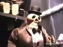Some Halloween items in the Gemmy toy fair from 2000. The items that are shown in action are Wild Rockin Rat - "Wild Thing" (Gemmy 1998), Hip Swinging Skeleton - "Puttin on the Ritz" (Gemmy 1998), Hip Swinging Monster - "Monster Mash" (Gemmy 1998), Dancing Mad Scientist - "Evil Ways" (Gemmy 2000), and Grim Reaper playing violin - "Death March" (Gemmy 1996). The items that made appearances, but weren't shown in action are Grim Reaper playing organ - "Great Balls Of Fire" (Gemmy 1998), Spinning Halloween Castle - "Monster Mash" (Gemmy 1998), and Dancing Vampire - "In The Midnight Hour" (Gemmy 1998).