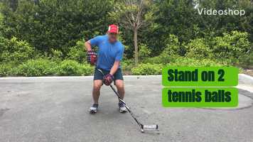 Stand on 2 tennis balls. Handle the ball using wide and narrow dribbles, with hands away from the body. Lift one foot, then the other. Exaggerate the knee bend, maintaining an athletic base.